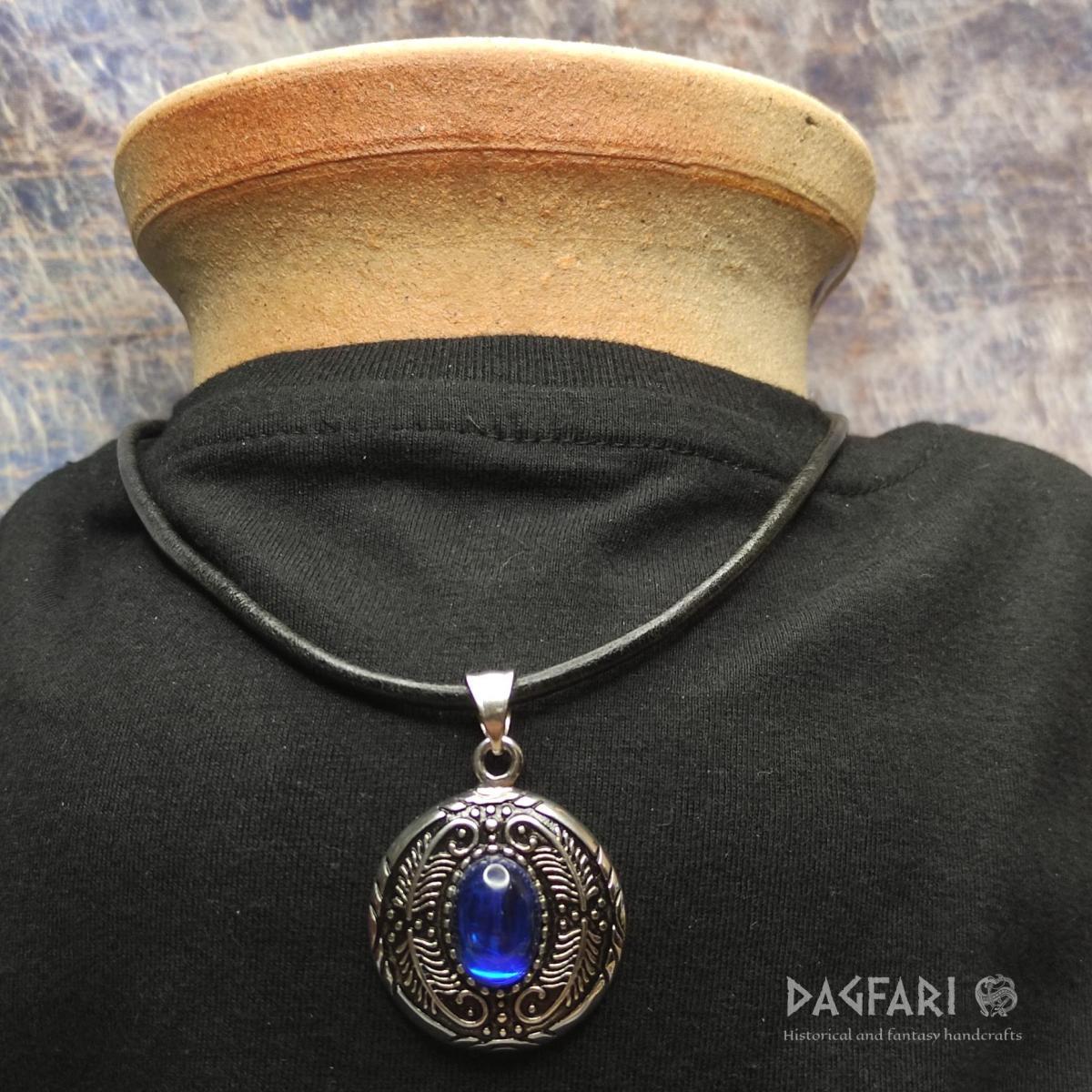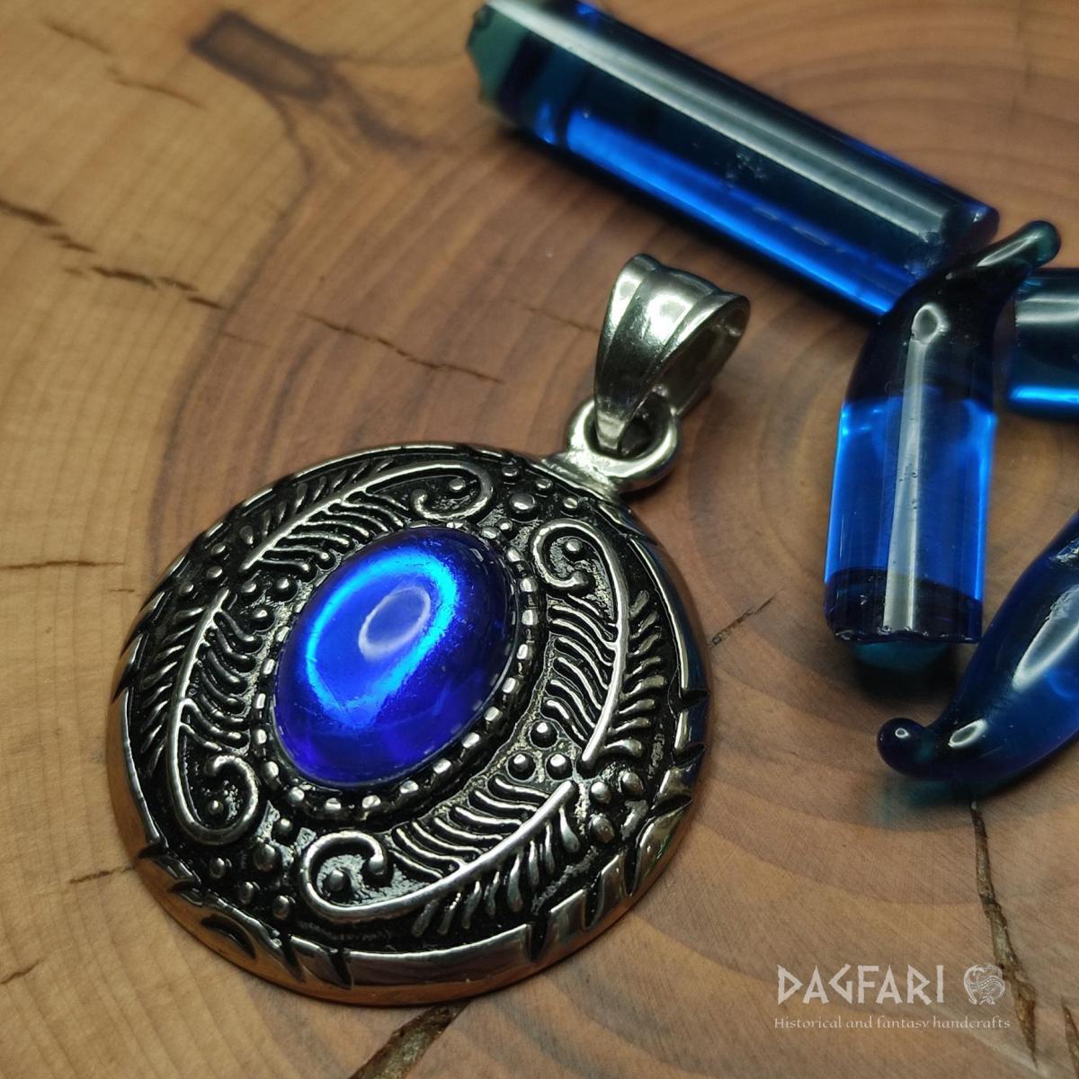 Nádherný amulet ve vintage stylu, s modrým syntetickým oválným sklíčkem.