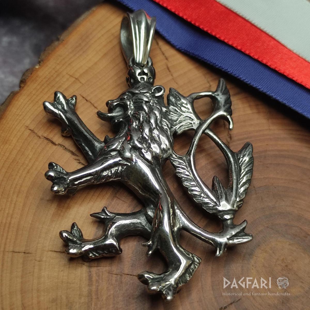 Český lev se jako symbol státnosti objevuje v Českých zemích již od 13. století,. od doby vlády Přemysla Otakara I. († 15. 12. 1230). Nahradil Svatováclavskou černou orlici. Zobrazujeme jej ve stříbrných barvách, se řvoucí tlamou směrem na západ.
